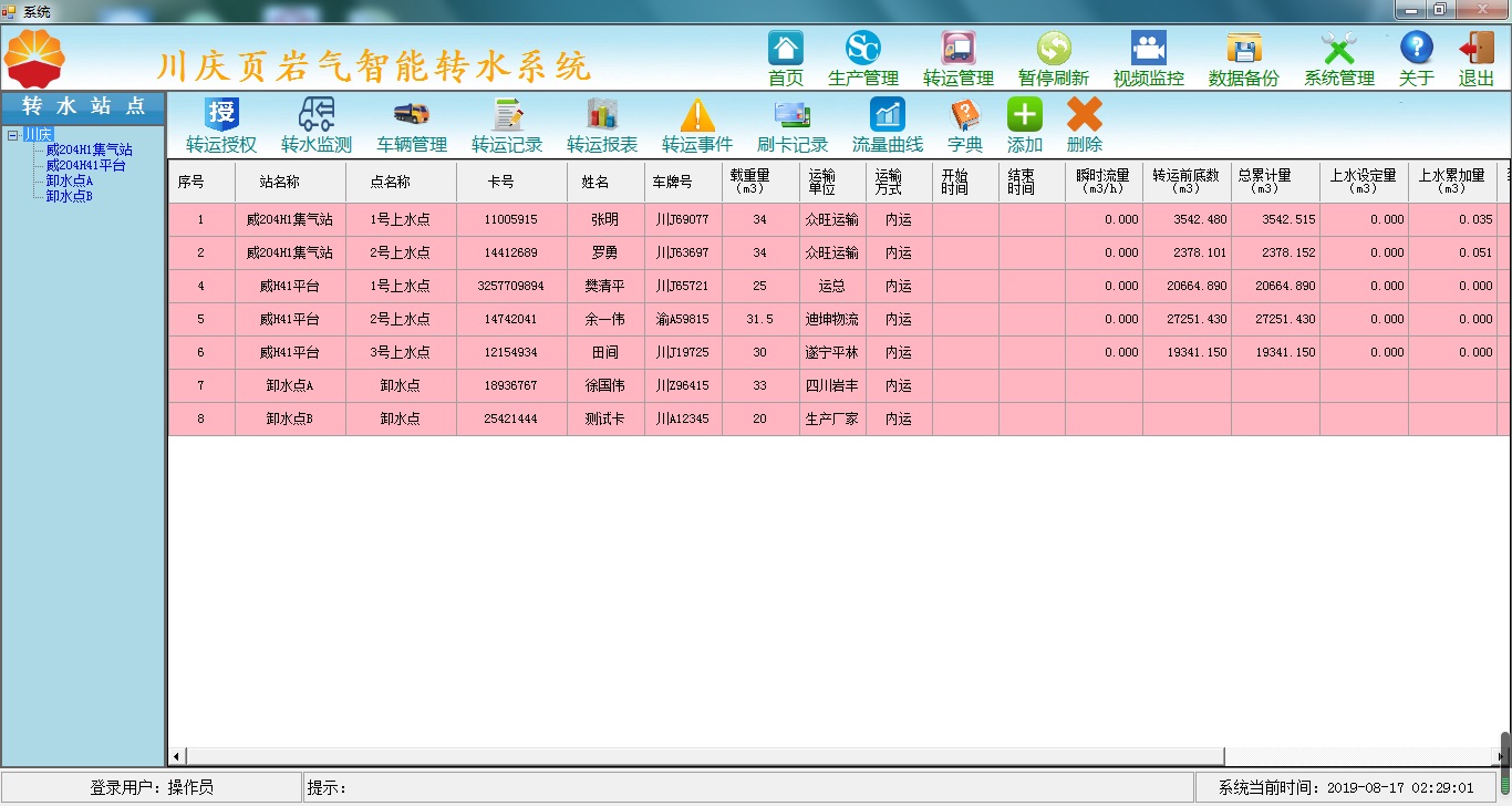 智能转水系统基于中石油川庆钻探需求开发,实现生产管理、转水车辆信息管理、转水车辆远程授权;自动记录转水车辆上水、卸水刷卡时间、转水量、泵运行时间;自动分析判断转水任务并形成转水报表导出EXCEL;记录系统事件、参数修改事件、报警事件等;转水平台采用4G VPN无线网络通讯、4G视频传输。